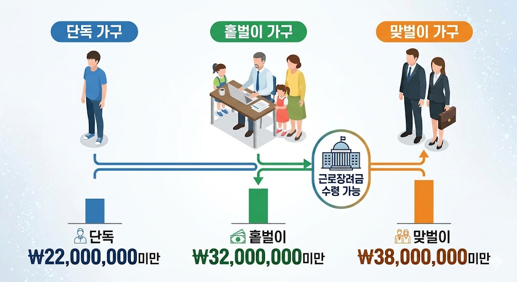 근로장려금을 받기 위해 가장 먼저 체크해야 할 것은 본인의 가구 구성입니다. 가구 유형에 따라 소득 기준 금액이 크게 달라지기 때문입니다.