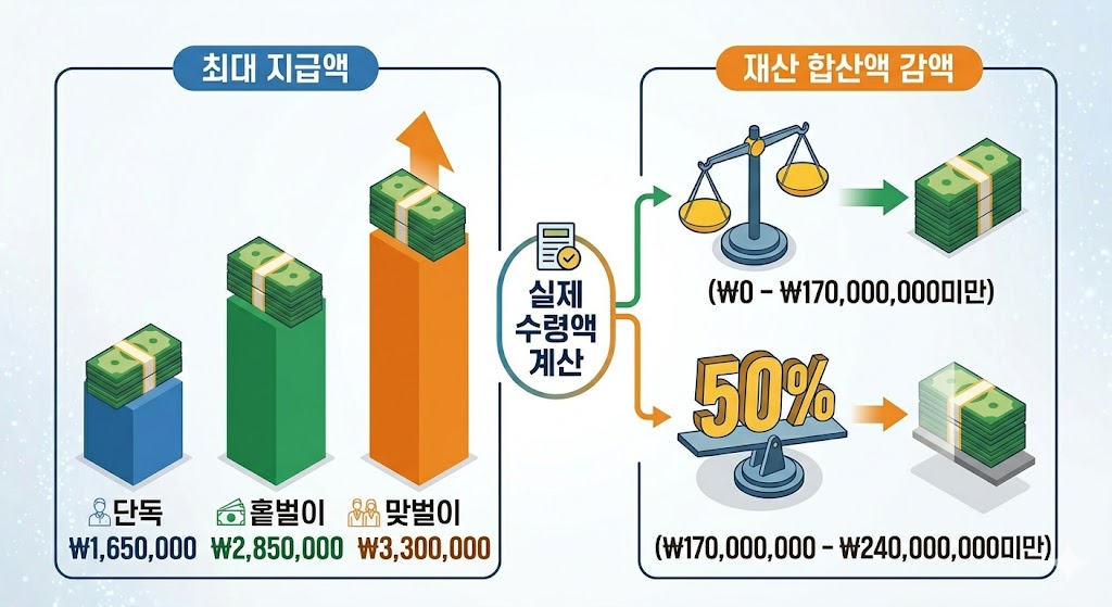 여기서 주의 깊게 보셔야 할 부분은 재산 합산액에 따른 감액입니다. 가구원 전체 재산이 1억 7천만 원 이상에서 2억 4천만 원 미만 사이라면, 소득 기준으로 산정된 장려금에서 50%가 차감된 금액만 지급됩니다. 본인의 소득이 최대 지급 구간에 해당하더라도 재산이 많다면 실제 수령액은 예상보다 적을 수 있습니다.