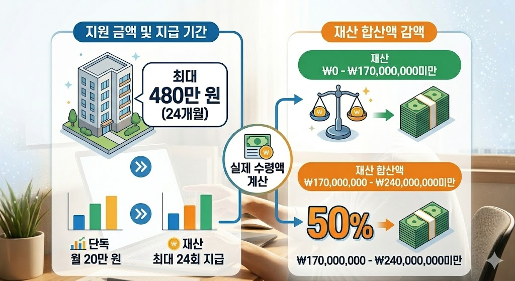 매달 최대 20만 원을 본인 명의 계좌로 현금 입금받게 되며, 2년을 모두 채울 시 총 480만 원의 혜택을 보게 됩니다. 실제 납부하는 월세가 20만 원 미만일 경우에는 실제 임차료만큼만 지급되며, 관리비나 공과금은 포함되지 않는다는 점을 유의하십시오.